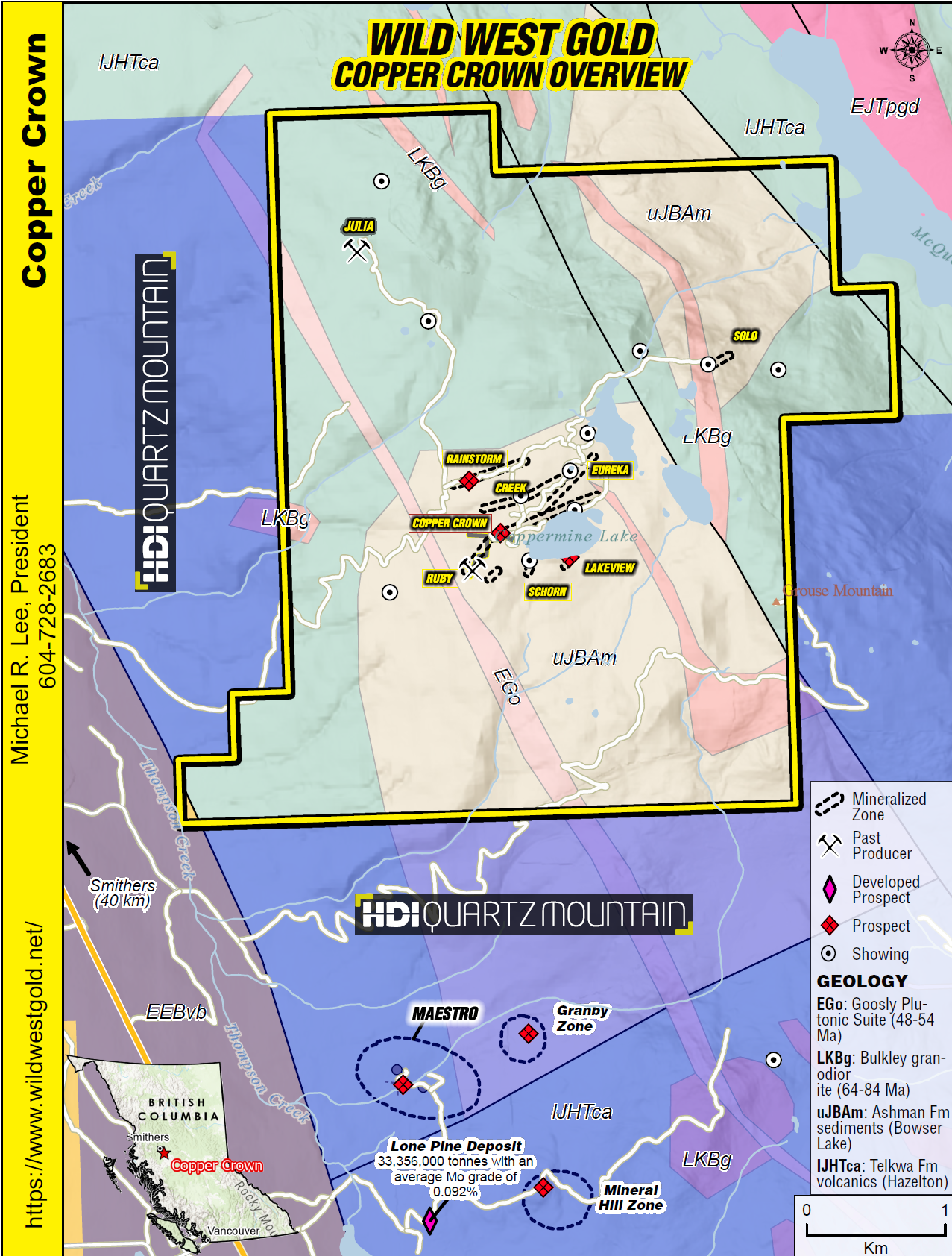 Overview of the Copper Crown property (containing Ag-Cu-Zn mineralization in 8 zones - an Equity Silver type target), situated north of HDI Quartz Mountain’s Maestro property ~45 km east of Smithers, central British Columbia.