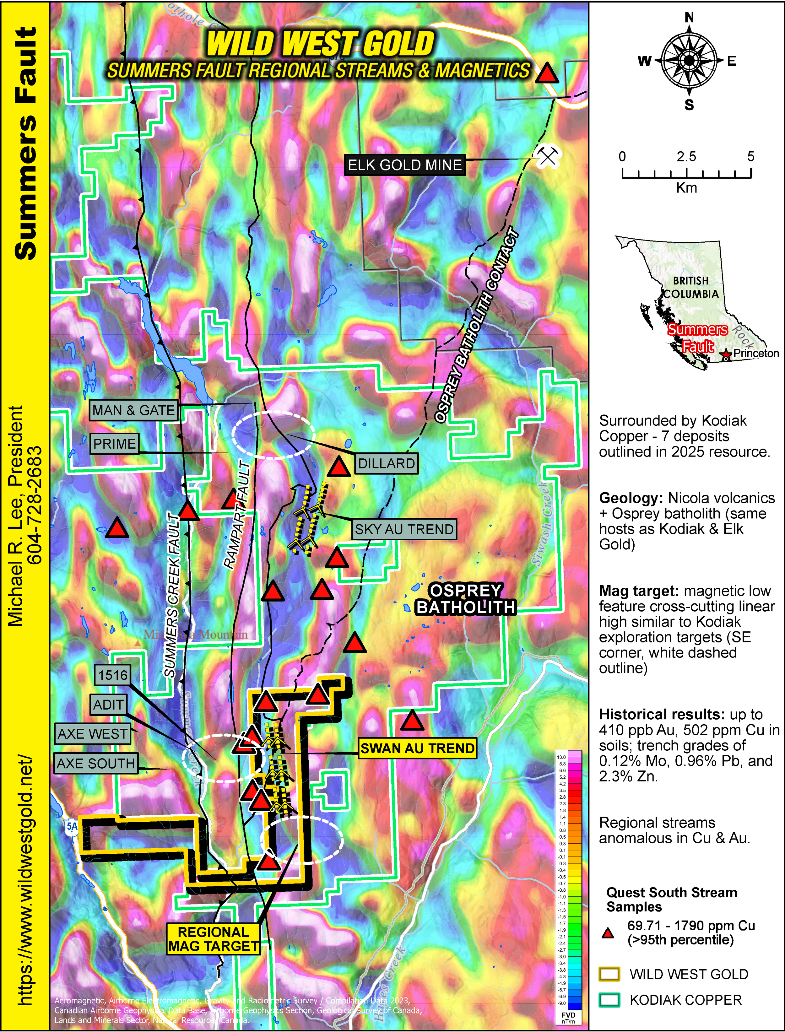 Overview of the Summers Fault property (containing porphyry copper and gold-quartz vein targets), situated adjacent to Kodiak Copper's MPD and Axe properties in the Princeton area of southwest British Columbia.